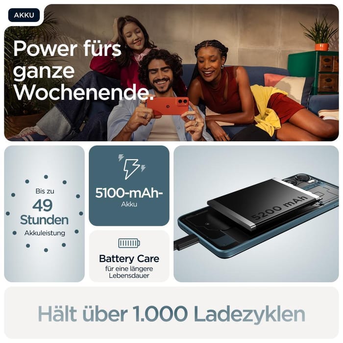 Einsatzmöglichkeiten Die angegebenen Angaben zur Akkulaufzeit sind Annäherungswerte, die auf optimalen Netzbedingungen basieren. Die tatsächliche Akkuleistung hängt von verschiedenen Faktoren ab, z. B. der Signalstärke, den Netzwerk- und Geräteeinstellungen, der Temperatur, dem Zustand des Akkus sowie dem Nutzungsverhalten, und kann daher von den Angaben abweichen. 5 [RAM-Boost-Funktion mit 4 GB internem RAM] 4 GB physischer RAM + bis zu 8 GB RAM-Boost (4 GB Standard | 8 GB max). Der verfügbare RAM fällt aufgrund der Anforderungen des Betriebssystems, der Software oder anderer Funktionen niedriger aus und kann sich aufgrund von Softwareupdates ändern. 6 [Speicher /RAM] Der für den Nutzer verfügbare Speicherplatz ist geringer, da Betriebssystem, Software und andere Funktionen einen Teil des Speicherplatzes belegen. Die verfügbare Kapazität kann sich durch Softwareupdates ändern. 7 [Bildwiederholfrequenz von 120 Hz] Die Mindestwiederholfrequenz des Geräts liegt bei 60 Hz und die Höchstwiederholfrequenz beträgt 120 Hz bei unterstützten Apps. Die tatsächliche Bildwiederholfrequenz hängt von den Einschränkungen und Anforderungen der jeweiligen Apps und Inhalte, den Geräteeinstellungen und anderen Faktoren ab. 8 [Bluetooth-Geschwindigkeit] Basierend auf einem Vergleich zwischen Bluetooth® 6.0 und der Vorgängerversion Bluetooth® 5.4. 9 [3,5-mm-Kopfhörer] 3,5-mm-Kopfhörer sind separat erhältlich. 10 [RAM / Speicher / CMF-Optionen / Spezieller Dual-SIM-Steckplatz / Ladeoptionen] Marktabhängig. Frag nach der Verfügbarkeit bei deinem Netzanbieter oder Fachhändler nach. 11 [microSD™-Karte] Unterstützt microSD™-Karten mit bis zu 1 TB (microSD™-Karten sind separat erhältlich). DRMeingeschränkte Inhalte können u. U. nicht auf der Karte gespeichert werden. 12 [NFC] NFC-fähiges Zahlungsterminal und App sind erforderlich. Käufe müssen per PIN autorisiert werden. Nutzt die Host Card Emulation (HCE)-Technologie, die kontaktlose Zahlungen über mobile Apps von Drittanbietern ermöglicht, die auf dem Android™-Betriebssystem ausgeführt werden. 13 [Akkukapazität] Die typische Kapazität beträgt 5200 mAh. Der typische Wert ist die geschätzte durchschnittliche Kapazität einer Charge von Akkus auf Grundlage interner Tests, die die erwartete Leistung unter normalen Bedingungen widerspiegeln. Die Nennkapazität beträgt 5100 mAh. Die Nennkapazität ist die garantierte Mindestkapazität eines Akkus unter kontrollierten Bedingungen. 14 [Smart Connect: Kabelloses Display] Die kabellose Verbindung über Smart Connect funktioniert nur mit TV-Geräten und externen Bildschirmen, die die Spiegelung von Android™-Smartphone-Displays (Miracast) unterstützen. 15 [Google Lens] Nicht alle Sprachen werden unterstützt. Die Liste der von Google Lens unterstützten Sprachen findest du auf lens.google.com 16 [Google Gemini] Die mobile Gemini-App ist auf bestimmten Geräten in bestimmten Sprachen und Ländern verfügbar. Internetverbindung erforderlich. Antworten auf Genauigkeit prüfen. 17 [Bass-Boost] Basierend auf einem internen Vergleich der Bassleistung der Lautsprecher zwischen dem moto g06 und dem Vorgängermodell moto g05. 18 [Preisspanne] Basierend auf der Kombination aus Stereo-Lautsprechern mit Bass-Boost und Dolby Atmos®, die auf den LATAM-/EMEA-/AP-Märkten (Preise zwischen 69 Euro und 119 Euro) nicht verfügbar sind. 19 [Lange Akkulaufzeit] Basierend auf internen Tests, die die täglichen Ladegewohnheiten der Benutzer in einer kontrollierten Laborumgebung simulieren. Die tatsächliche Akkulaufzeit hängt von dem individuellen Nutzungsverhalten, Lademethoden, Temperatur und anderen Faktoren ab. Die Akkulaufzeit kann mit der Zeit abnehmen