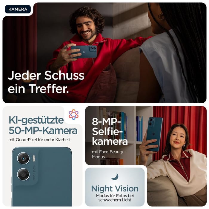 Wir präsentieren das moto g06 – ein Smartphone, das deine Erwartungen weit übertreffen wird. Erwecke deine Lieblingssendungen und -filme zum Leben auf einem riesigen, hellen 6,88" Display, unserem bisher größten auf dem moto g, mit Stereo-Lautsprechern und Dolby Atmos®-Sound. Mit dem KI-basierten 50-MPKamerasystem machst du atemberaubende Fotos bei jedem Licht.1 Supereffizientes Multitasking mit bis zu 12 GB RAM mit RAM-Boost.2,5,6,10 Alles ganz entspannt dank erweiterter Funktionen für eine längere Lebensdauer und Premiumdesign, darunter IP64-Wasserschutz3, Corning® Gorilla® Glass 3 und lederinspiriertem Finish. Mit einmal Laden bist du 2 Tage dabei.4 Und exklusive Moto-Funktionen machen dein Smartphone sicherer, individueller und unterhaltsamer. Mit Circle-to-Search kannst du sofort alles auf deinem Smartphone suchen. Hol dir mehr mit dem moto g06.