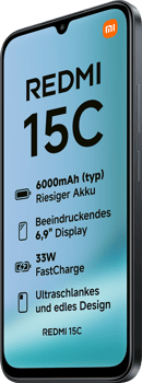 Der 6000-mAh-Akku des Redmi 15C bietet eine beeindruckende Laufzeit, die Sie durch den Tag und darüber hinaus bringt. Mit 33W FastCharge ist Ihr Gerät im Handumdrehen wieder einsatzbereit. Zusätzlich unterstützt das Smartphone 10W kabelgebundenes Reverse Charging, sodass Sie andere Geräte unterwegs laden können. Der moderne USB Type-C-Anschluss sorgt für eine schnelle und zuverlässige Verbindung.