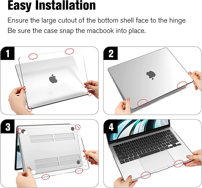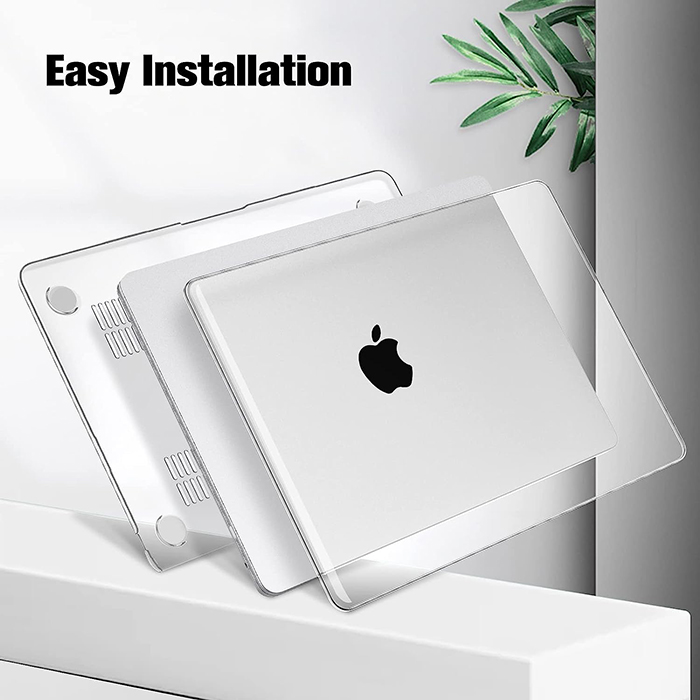 2-teilige ultradünne leichte Schale, vollständig abnehmbar, einfach ein- und auszuschalten. Auf der Unterseite befinden sich Belüftungslöcher, vollständig belüftet für sichere Wärmeableitung. 4 Gummifüße halten Ihr MacBook stabil und sicher.